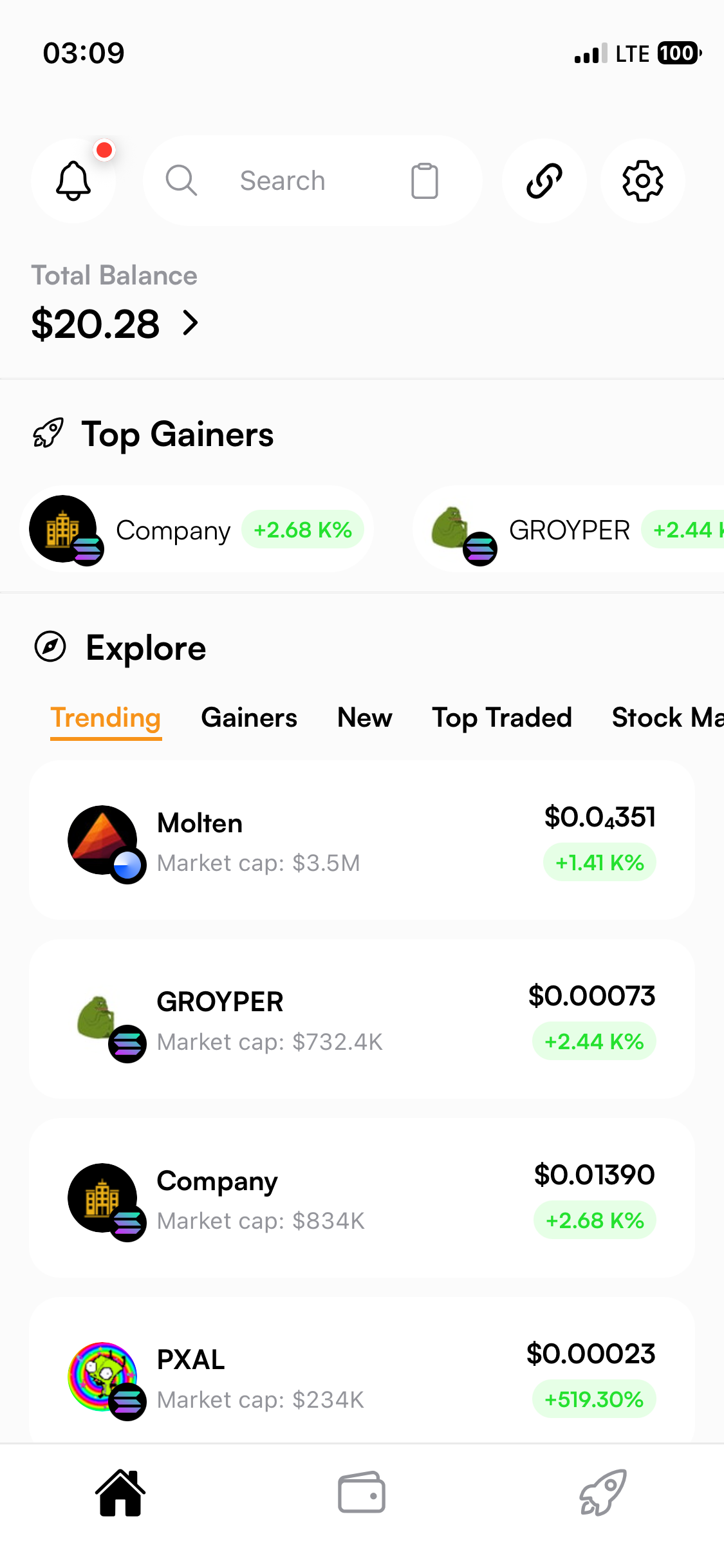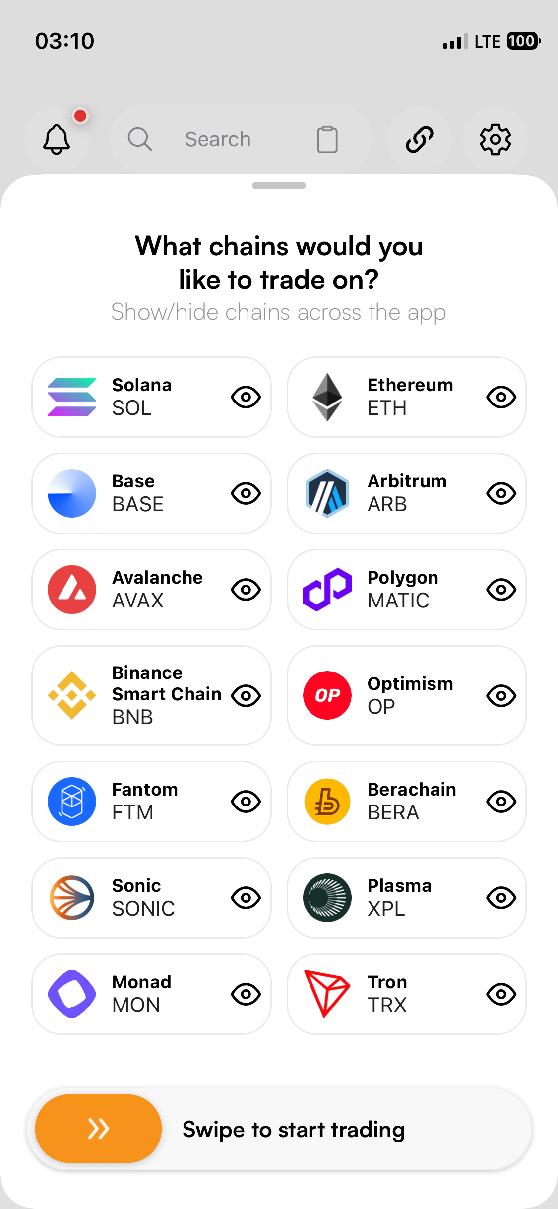 Trade across 14 networks in under 200ms. Rug detection, self custody wallets, and fiat onramps. One app, 13 languages.